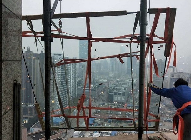 在進(jìn)行吊裝作業(yè)前,施工人員想將所要吊裝的建筑材料用吊裝帶捆綁固定好,有棱角的地方用保護(hù)套套住,以防劃破吊裝帶。樓上把吊具放下鉤掛住吊裝帶,樓下兩名工人用力往大樓的反方向拉動(dòng)牽引繩,讓所吊物品和樓面保持一定距離,避免撞上墻面或者玻璃墻。